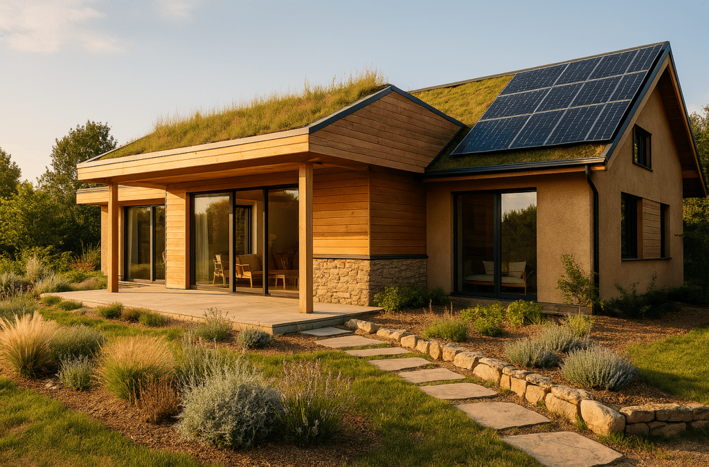 Maison bioclimatique avec toiture végétalisée et panneaux solaires – Architecture écologique